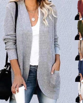 Damski sweter z miękkiej dzianiny z długim rękawem Otwarty przód Luźny sweter z kieszeniami na co dzień L beżowy