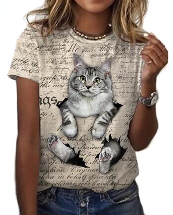 Cute Cat Pattern T Shirt For Women Animal Printed Short Sleeves Summer Fashion Crew Neck Tops Girl Tees Oversized T-Shirts S