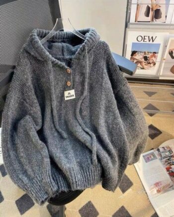 Spring and Autumn Women’s Fashion Loose Drawstring Hooded Knitted Sweater XXL szary