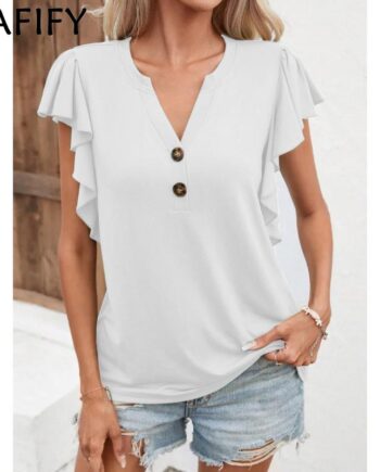 T-shirty i topy damskie DAFIFY Fashion Summer Casual Jednokolorowe nadruki z krótkim rękawem i dekoltem w kształcie litery V S biały