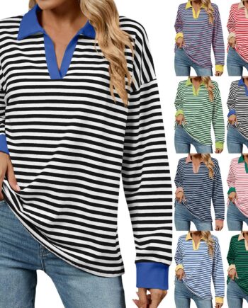 Ladies’ Fashion Striped V Neck Long Sleeve Casual T-shirt Sweatshirt Top L czarny