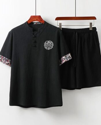 Męska letnia cienka płytka zapinana na guziki T-shirt lniany garnitur z krótkimi rękawami modny chiński styl męski bawełniany i lniany retro stójka dwuczęściowy zestaw 9XL biały